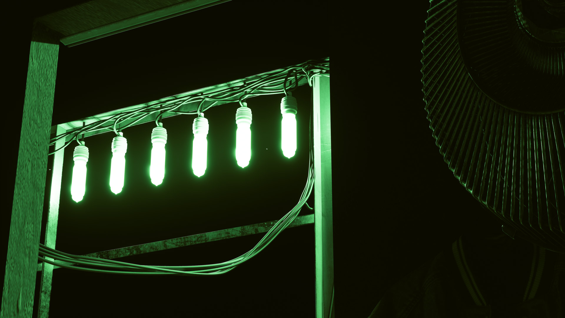 Dozing Overpass is an experimental CGI film. The work is based on field research in a fishing village on the Huangqi Peninsula, Fujian, China. The protagonist (featuring the artist Guangli Liu) drives across a bridge in his sleep, heading toward a foreign land he has never visited. Amidst the persistent and violent sound of snoring, the green lights used for squid fishing illuminate his face and his dreamscape.